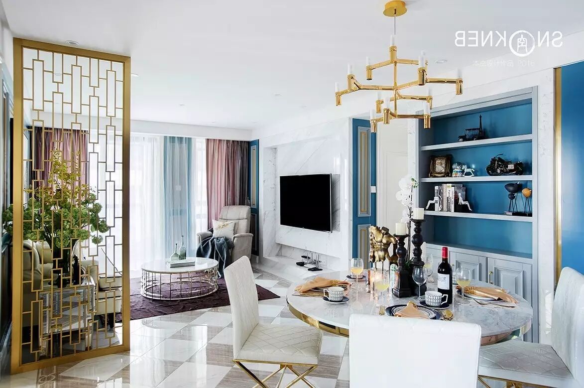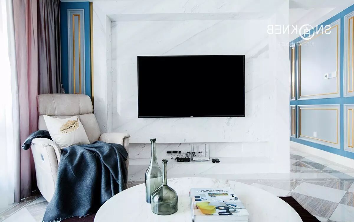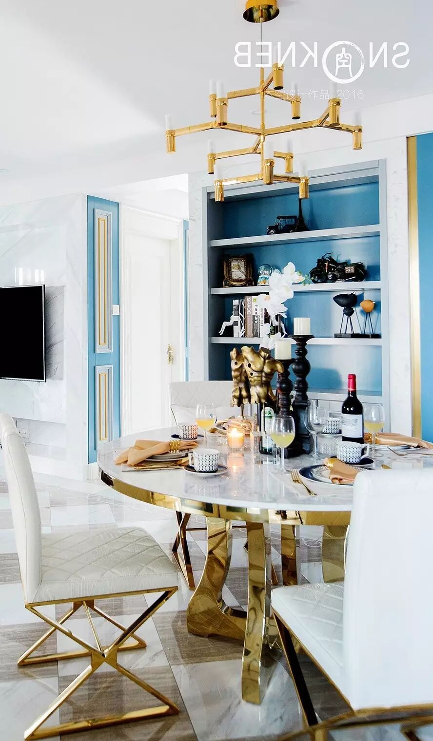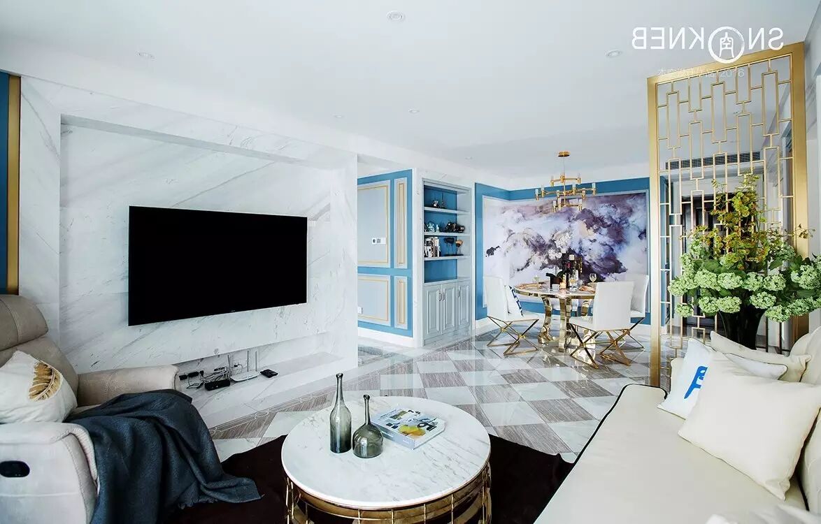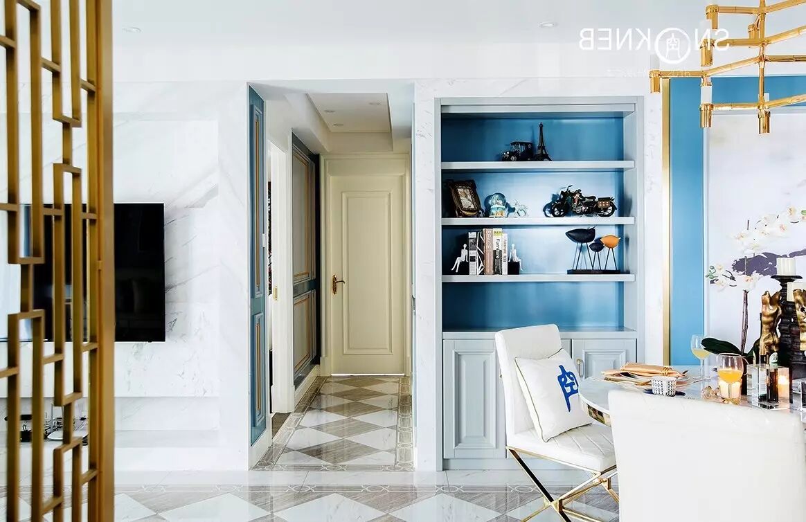 從餐廳觀客廳,大面積爵士白大理石為空間增加明度,減少深藍(lán)色帶來(lái)的沉重。