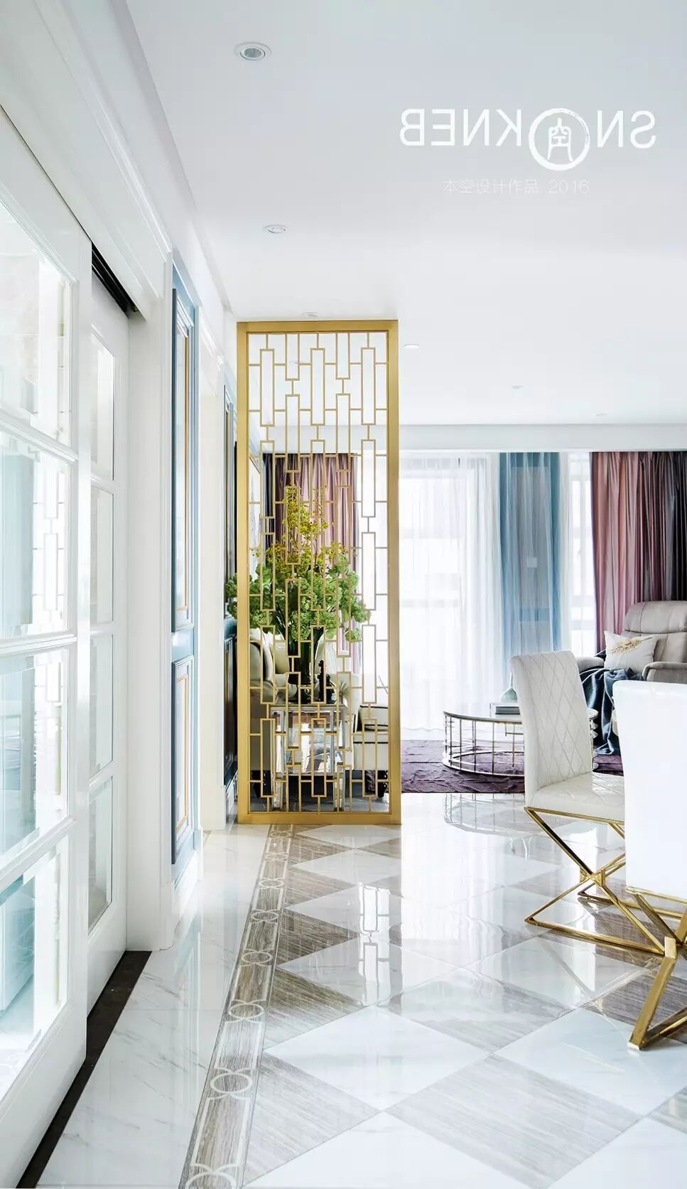 首先進(jìn)入你眼簾的是蜂蜜色純銅制屏風(fēng),透過(guò)屏風(fēng)隱約的看到柔軟的沙發(fā),轉(zhuǎn)交遇到餐廳,3D墻紙個(gè)轉(zhuǎn)角增加透視感,讓餐廳的空間更具有包裹性。陳設(shè)方面讓蜂蜜色有點(diǎn)線面上呼應(yīng),增加一定的輕奢感。
