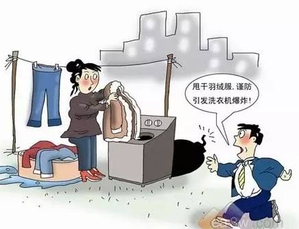 平常家用的洗衣機(jī),一般分三大類:老式雙缸波輪洗衣機(jī)(半自動)、單缸全自動波輪洗衣機(jī)、滾筒洗衣機(jī)。 而發(fā)生爆炸的幾乎都是波輪洗衣機(jī),尤其是老式雙缸波輪洗衣機(jī),新生產(chǎn)的滾筒洗衣機(jī)基本都能洗羽絨服,使用前最好看清楚說明書。 一般的波輪洗衣機(jī)說明書都會提醒:“請不要洗滌防水性衣物(如:雨披、羽絨服、浴簾、睡袋等)”。 而且像羽絨服、羊毛衫等衣物上一般都有“不可機(jī)洗”等提示,你注意到了嗎? 至于其他透氣性較差的衣物,如雨衣等也應(yīng)避免機(jī)洗甩干,以免發(fā)生意外。 同時(shí),在用洗衣機(jī)洗衣物之前,特別要注意清理一下口袋,特別是打火機(jī)等易燃易爆的物品,千萬不能放進(jìn)洗衣機(jī)。